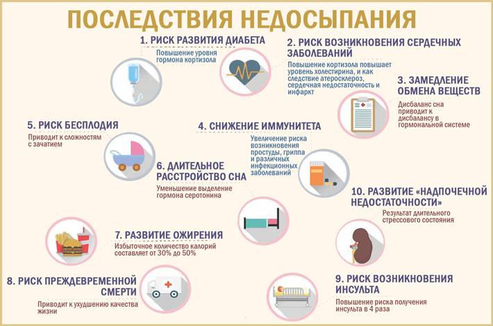 А нехватка сна грозит нарушением циркардных ритмов, хронической усталостью, снижением эмоционального состояния и работоспособности, нарушением концентрации внимания, снижением иммунитета, депрессией, бессонницей.